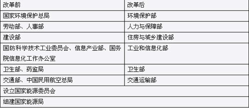 ????新時期以來的第6次國務院機構改革拉開帷幕。根據11日披露的國務院機構改革方案,國務院將新組建工業和信息化部、交通運輸部、人力資源和社會保障部、環境保護部、住房和城鄉建設部。改革后,除國務院辦公廳外,國務院組成部門設置27個。