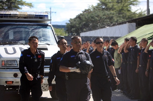 1月16日,在海地首都太子港,中國駐海地維和警察防暴隊的官兵向被埋戰(zhàn)友的遺體敬禮。 新華社記者邢廣利攝