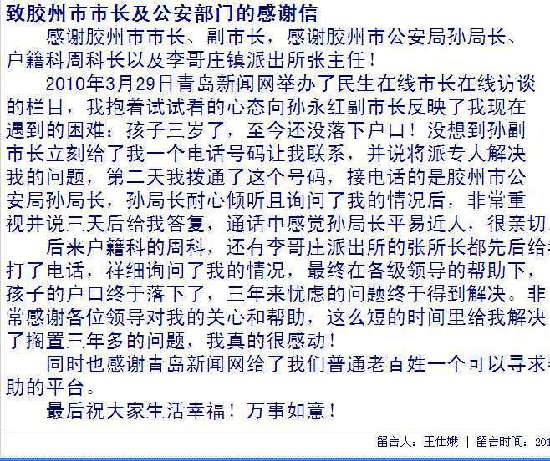 王女士在青島新聞網(wǎng)發(fā)出的感謝信 ??? 記者采訪了解到,像王女士這樣的情況并非個例,許多村莊都有這方面的“土規(guī)定”:女性青年出嫁后不再享受村里待遇,孩子也不能隨母親落戶,要落戶必須交3000-5000元的“保證金”。膠州市副市長孫永紅做客“民生在線”后,一系列類似問題迅速得到解決,政府有關(guān)部門的辦事效率受到了網(wǎng)友的稱贊。(記者 任俊峰) |