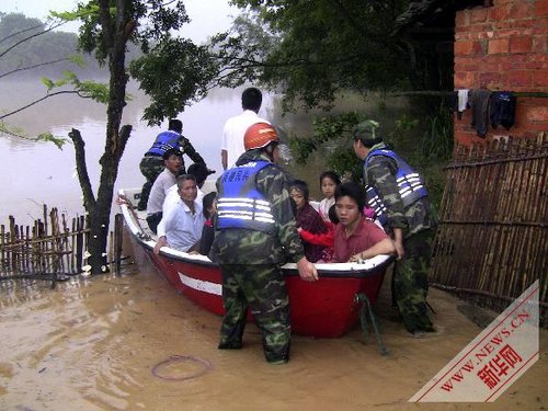 5月7日,廣東英德市人武部民兵緊急轉移群眾。自5日起,廣東突遭特大暴雨襲擊,局部地區發生洪災,北江支流滃江出現超30年一遇洪水,韶關、清遠等市水情較重。截至7日13時,特大暴雨已造成廣東6人死亡,3人失蹤,緊急轉移群眾5萬多人。新華社發(李作描 攝)
