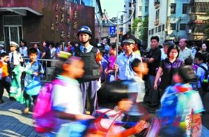 ????放學時分,東城小學門口,治安隊員正在守護學生安全。記者黃澄峰攝