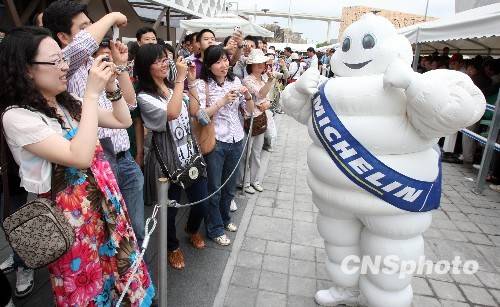 ????隨著世博園參觀客流逐步上升,那些熱門場館均需排隊2、3小時以上才能進館。6月4日,一位“輪胎小人”在世博法國館前與排隊等候進場的游客熱情互動,為他們“解悶”。 中新社發 湯彥俊 攝