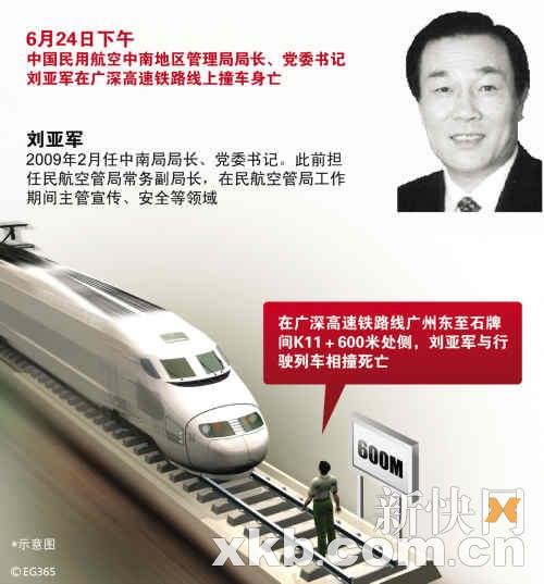 ????據(jù)一名知情人士透露,劉亞軍于6月24日下午在廣深高速鐵路線的廣州東至石牌區(qū)間K11+600米處與一輛行駛的列車發(fā)生相撞,當場身亡。接到群眾報警后,廣鐵公安部門立即派出民警前往現(xiàn)場勘查,調取現(xiàn)場附近的監(jiān)控探頭錄像查看,同時,對死者身份進行核查工作。經(jīng)過核查,證實死者為中國民航局中南局局長、黨委書記劉亞軍。