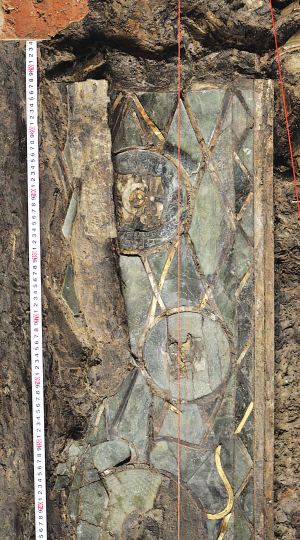 ????而玉棺的發(fā)現(xiàn)更為驚人,現(xiàn)場已發(fā)現(xiàn)玉棺的一面?zhèn)劝逑鄬ν暾牡顾樾危瑐劝迳翔偳队写罅苛庑斡衿虚g則用刻有紋飾的玉壁填充,而在玉片之間的連接處均用金箔條和銀箔條進行貼邊鑲嵌,玉壁上則用銀片進行粘貼,外表上金光、銀光、玉光交織在一起,分外鮮明。在棺木上,細細查看,不難看出一些閃亮的紋飾,“這座棺木是金鑲玉的,十分罕見。目前,只有河北滿城漢墓和徐州獅子山楚王陵出土過。”