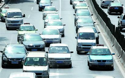 ????記者注意到,許多心急的出租車司機將車開至兩條車道分離白線位置,伺機往前沖,無奈前方的車輛密密麻麻,一名司機做過多次嘗試后只好放棄,堵車“長龍”只得亦步亦趨往前“蠕動”。