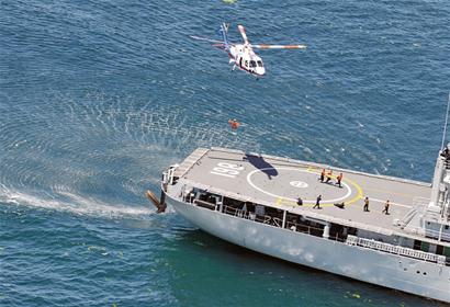 ????“一艘運送重要物資的貨輪從青島港南下至朝連島附近海域,與1艘北上客輪相撞,船體破損、起大火,多名人員落水、受傷,部分裝備物資沉入海底。兩船發出求救信號!”前天早上7時55分,山東省海上搜救中心接到報警后,立即將情況通報北海艦隊,開展緊急搜救。8時整,隨著演練總指揮、北海艦隊副司令杜希平一聲令下,一場由北海艦隊主辦,以某作戰支援艦支隊海上應急搜救隊為主體兵力,北海艦隊航空兵、青島保障基地、401醫院、山東海事局、交通部北海救助局、北海第一救助飛行隊等單位密切配合的“海上聯合搜救實兵演練”,在青島朝連島附近海域拉開帷幕。800多名軍地參演兵力快速集結,船艇劈波斬浪,直升機緊急起飛,趕赴出事海域實施救援。