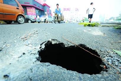 ????記者走上前去觀察,發(fā)現(xiàn)這個(gè)洞長約20厘米寬約15厘米,距離這個(gè)坑洞一米遠(yuǎn)處就是一個(gè)雨水古力,而順著洞口望下去,這個(gè)洞深約2米,視力所及范圍內(nèi),約五六平方米的地方已經(jīng)懸空,磚頭砌成的雨水井壁也已坍塌,連接的水管早已斷裂破爛掉。而坑洞附近地面只有一層瀝青面支撐著,壓力稍大隨時(shí)有塌陷的可能。市民張先生告訴記者,這個(gè)坑前天就出現(xiàn)了,只不過很小,很多人沒有注意,而隨著來往車輛的碾壓,這個(gè)坑越來越大,他發(fā)現(xiàn)下方已經(jīng)抽空了,如果有大型車輛經(jīng)過準(zhǔn)會(huì)被軋塌,車子陷進(jìn)去就麻煩了。