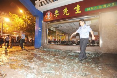????“剛才我經(jīng)過遼寧路時突然聽到‘轟’的一聲響,接著就聽到大片玻璃砸在路上的聲音,我停下車趕過去看時,發(fā)現(xiàn)很多人從一家牛肉面店里跑出來。”昨天晚上7時30分,出租車司機遲先生撥打早報熱線82888000說。記者趕到現(xiàn)場看到,李先生加州牛肉面店里漆黑一片,店門前停著兩輛消防車。消防隊員打著手電在店內(nèi)查看,兩名民警隨后用警戒線將現(xiàn)場封閉。牛肉面店1樓和2樓兩層臨街的窗玻璃被炸得粉碎,人行道上滿是大小不一的碎片。