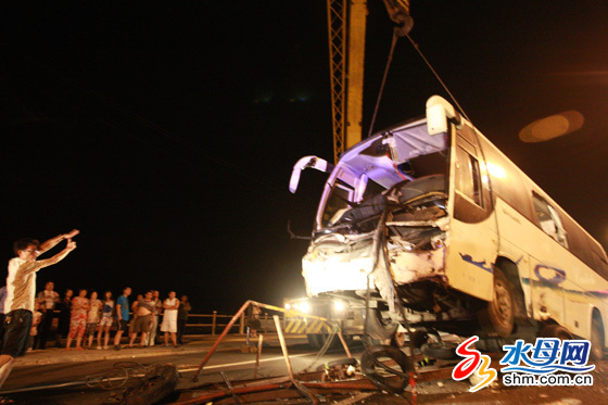 ????昨晚8時30分,記者接到96110熱線報料后,立即趕到事發現場。只見在東泊子橋上,一輛養殖船倒扣在路面上,運送養殖船的拖拉機拖掛被壓在大巴車的底部,大巴車前擋風玻璃完全破碎,車頭嚴重變形。