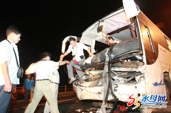 ????昨晚,在煙臺市萊山區東泊子橋上,一輛青島旅游大巴車在轉道煙臺去大連的途中,與一輛拖拉機相撞,17名湖北乘客與拖拉機駕駛員受傷入院。