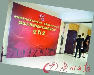 ????記者在現場看到,會議廳門口豎起了大紅的告示牌,上面用大字寫著“中國世代投資集團有限公司、凱愛資本投資有限公司媒體見面暨維權行動啟動儀式簽到處”,在該簽到板上,還有人用彩筆簽下了名字,會議廳簽到處有兩道門,進入會場必須佩戴專門的印有“中國世代”字樣的紅色證件。有自稱酒店工作人員的人員手拿名單站在門口核對人員信息,并告知記者“只有名單上有的才能對號入場,如果名單上沒有,沒接到邀請的一概不能入場。”