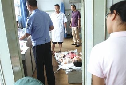 ????砍人的梁某正坐在急診室地板上,身前的T恤也被鮮血染紅,3名男醫(yī)生站在他的身旁,緊張地注視著他的一舉一動。記者看到,梁某的情緒仍然比較激動,不斷用頭碰著地板,醫(yī)生無法靠近為他救治。
