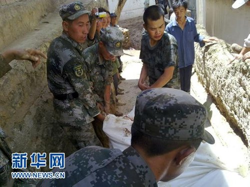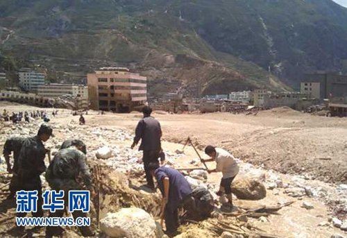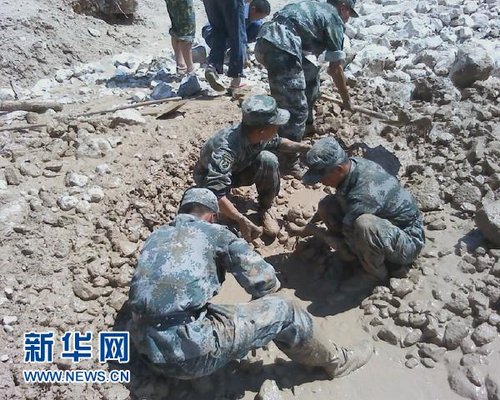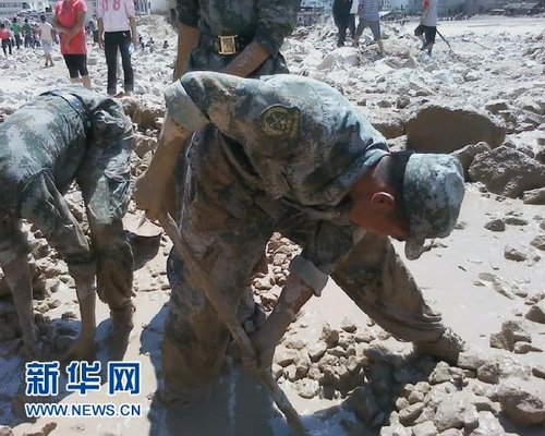 8月8日,蘭州軍區某集團軍防化團官兵正在搜尋遇難者遺體。