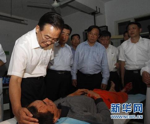 這是溫家寶在舟曲縣人民醫院看望傷員。新華社記者 李學仁 攝