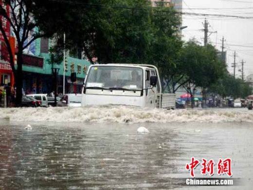 9日下午3時左右,山西運城市上空烏云密布電閃雷鳴,緊接著暴雨傾盆而下,持續近40分鐘的暴雨讓運城市區變成一片汪洋。圖為汽車在積水中艱難的行駛。 陳衛 攝