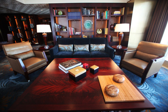 主樓大廳極盡奢華,墻體上是仿古的窗欞造型,密布的方形裝飾上貼有24K金箔,另一面玻璃隔墻上貼滿數百個打磨成圓形的石子,與大廳的金碧輝煌相映成趣,大廳四個水晶燈據稱從捷克進口,價值不菲。