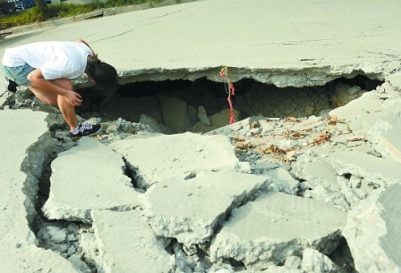 ????他聽鄒師傅說,大前天晚上六七點的時候,突然聽到“轟”的一聲。出來一看,企業門口不遠處的公路塌方了,出現了一個“能把人埋進去”的口子。