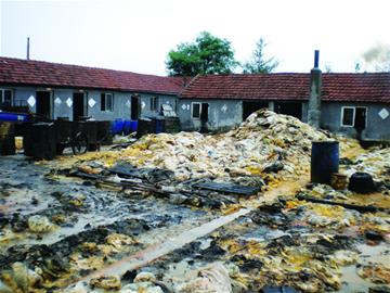 ????看到煙囪里冒著煙,記者繞到了房屋后面的露天加工間,發現兩名工人正在忙碌著。 8個原料池里裝著油脂類漂浮物,工人說是“雞下貨”。記者在現場看到,三個熬油用的大鐵鍋里裝滿了泔水,經高溫加熱后,工人撈出了漂浮物,繼續提煉剩余的初級油脂,而一名工人竟把塑料袋也扔進火里焚燒。記者撈起一勺正在加熱的油脂,一股惡臭襲來。屋內的加工間里,有幾個過濾原料的池子,堆放了多袋動物下貨原料。 “你們的地溝油從哪進的? ”記者問。 “油是從飯店買的,也有自己弄的。”工人說。“你們加工完再送回飯店,還是有車來拉貨?”記者問。“這個老板說了算,老板現在不在。 ”一名工人思考后回答。