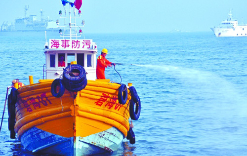 ????下午3時30分許,海事局又派來一輛更大型的清污船,船上工作人員打開噴槍朝著海面上噴灑消油劑。“我們準備再派出一艘大型的清污船,盡快將這些油污清理掉。”青島海事局工作人員說。“相信五六個小時后海水中的油污就會清除干凈,等這些工作做完后,我們還會在海面上鋪設一層吸油氈,從而保證海水不會受到污染。”青島海事局監管二處處長李紅星介紹說。