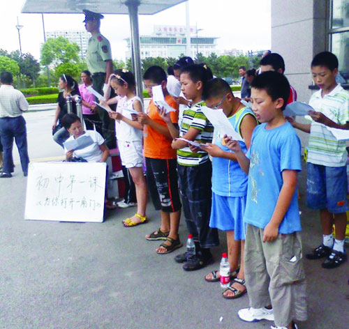 ????9月1日上午7:50,12名應(yīng)該坐在教室里的孩子出現(xiàn)在了鹽城市政府大門外,和他們?cè)谝黄鸬模€有幾十名表情嚴(yán)肅的家長(zhǎng)。
