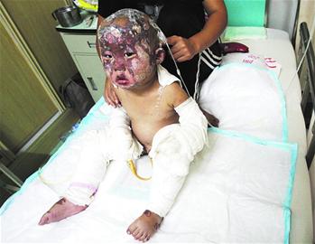 ????昨天下午,記者趕到醫院時,21個月大的琪琪已經脫離危險,但是雙腿和胳膊依然被厚厚的紗布包裹著,頭部燒傷部位已經變成紅褐色。“琪琪是50%的重度燒傷,琪琪的爺爺為了救孩子傷得更重,全身60%嚴重燒傷,明天做手術。”琪琪奶奶哭著向記者介紹說。