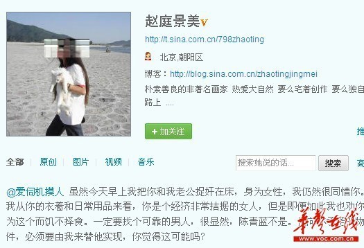????“早上我回家,看到床上 @北京陳青藍 和@愛伺機摸人 裸在我的床上。”昨天早上7:05,北京女畫家趙庭景美在她的實名微博上發出的這條信息無疑是“平地起了炸雷”。“北京陳青藍”就是她的老公,“愛伺機摸人”是個“小三”。緊接著,她開始“現場直播”事情進展: