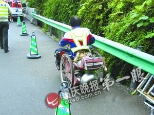 李遠(yuǎn)倫搖著三輪自行車(chē)在高速上行駛 記者 楊帆 攝