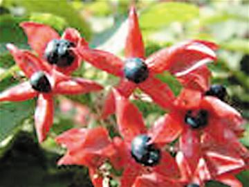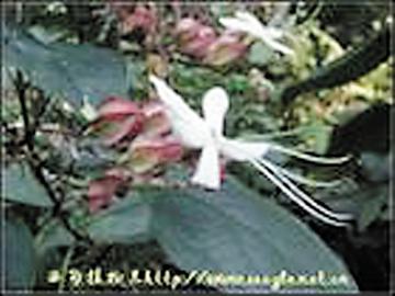 ????3、(投票選號133)學名:海州常山,別名:臭梧桐、紅五星。落葉闊葉類小喬木,或呈灌木狀,高可達8米。單葉對生 。傘房狀聚傘花序著生頂部或腋間,花冠細長筒狀,白色或粉紅色。核果球狀,熟時紫色。整個花序可同時出現紅色花萼、白色花冠和藍紫色果實的豐富色彩。花期6-7月,果期10-11月。