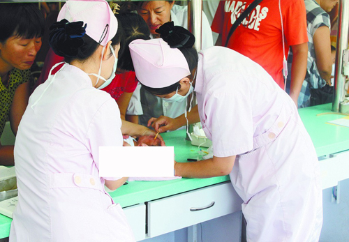 ????9月15日中午12點半,注射窗口,三名護士正在窗口內不停地忙活著給孩子打吊瓶,窗口外六七位家長正抱著孩子讓護士打針。“現在這個點是人少的,今天上午的人才多。”護士長劉小臻趁空閑時告訴記者,有孩子需要打針,劉護士長就迅速配藥去了。