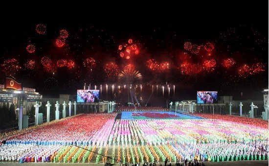 10日晚,朝鮮首都平壤,霓虹燈將大街裝飾一新,著名景點的周身被探照燈照亮;金日成廣場,焰火繁花似錦,群眾方陣用道具模擬出各種圖案和造型。朝鮮勞動黨建黨65周年慶祝活動在這里舉行,今晚的平壤變成名副其實的不夜城。