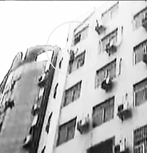 ????昨日,記者趕赴衡陽,找到了幾位目擊市民。其中,有位市民用手機拍攝下時長27秒的墜樓全過程。視頻顯示:蘇莉坐在7樓樓道窗口,先有兩條內褲掉下,再是女孩的手提包掉下,然后,她大喊著“爸爸”及一陣撕心裂肺的吼叫聲后就墜下地面。由于不夠清晰,看不清楚蘇莉是如何掉下樓的。