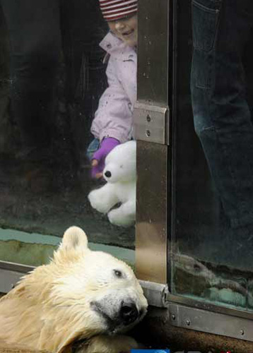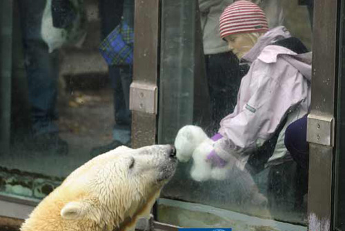 ??? 據(jù)法新社和《每日電訊報(bào)》報(bào)道,德國(guó)柏林一家動(dòng)物園的北極熊“納特”不幸被園中同伴排擠欺負(fù),卻在一個(gè)小女孩手中的玩具小熊身上找到同胞愛。