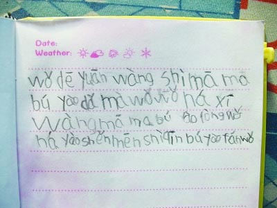 ????一年級(jí)女兒第一篇“拼音日記”讓母親淚流滿面久勤 萬凌云本報(bào)訊 剛上一年級(jí)的女兒卉卉(化名)睡熟了,家住鎮(zhèn)江桃花塢新村的王女士,無意中看到了女兒寫的第一篇日記,當(dāng)看到用漢語(yǔ)拼音拼出的日記的第一句竟然是“我的愿望是媽媽不要打罵我”時(shí),想到自己“盼女成鳳”心切而對(duì)女兒的“嚴(yán)格”教育,王女士忍不住淚流滿面。昨天,卉卉父親給記者講述了女兒日記惹哭母親的故事。