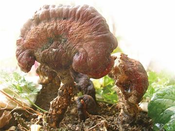 ????記者在現場看到,其中一株粗壯的靈芝菌蓋中還穿插著一段枯木的樹枝和兩根枯草,十分新奇。“這兩棵草其實是真正意義的傳說中的靈芝草,這兩棵草從靈芝菌蓋中穿生出來,處于一種共生狀態,真是難得一見啊。”對于植物頗有研究的賈先生告訴記者。 (記者 吳帥 攝影報道)