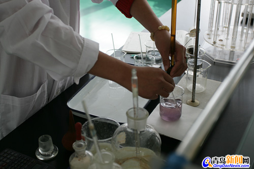 進場的食鹽在分裝之前,要進行化驗。工作人員正在進行碘含量的測試,主要看碘加入得是否均勻、穩定。