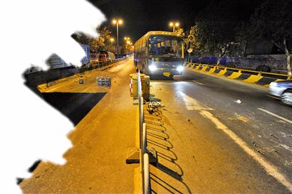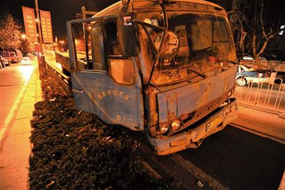 ????22時50分,記者在雁山立交橋南下橋口見到了事故車輛。這輛裝滿方磚的藍色卡車向右倚在立交橋護欄上,右前輪爆了胎,卡車占據了下橋口的整個車道,卡車邊上立起一塊石質雨箅子作為警示,但在夜色下這塊 “警示牌”形同虛設,許多車輛都是駛近后才發現路邊的卡車已經爆胎。讓記者驚訝的是卡車后面約20米的排水溝全被軋壞,雨箅子有的被整個掀開,有的被軋得粉碎,橋護欄有明顯的摩擦過的痕跡。