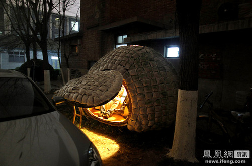 ????11月30日,在北京海淀區(qū)成府路一個大院里,一座“蛋形”小屋矗立在草坪上。這是24歲的北漂小伙戴海飛利用公司的設計創(chuàng)意,用竹子和麻包片打造出的安身之所。戴海飛的老家在湖南邵陽的鄉(xiāng)下,父親在建筑工地干活,母親在一家公司做清潔工。戴海飛在湖南讀大學,畢業(yè)后做了北漂一族。他說,父母年紀大了,卻仍然在奔波,希望給他存錢娶媳婦,“他們不知道以他們的工資水平,在北京買套房需要工作兩三百年。”