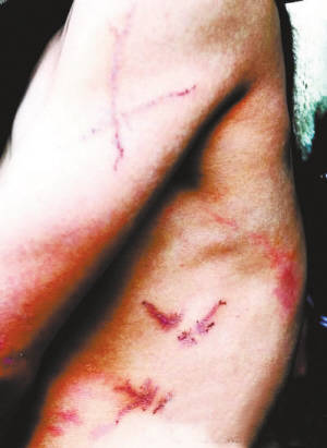 ????等大家幫方某把衣服脫下看時,都被驚呆了,他左胳膊和左腰部出現了多處血紅圖案,既像“文身“,又像“象形字”。令在場人費解。