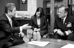 ????日本防衛大臣北澤俊美9日與馬倫舉行會談,雙方表示要加強日美韓三國防衛合作,并將這種合作提升至戰略水平。