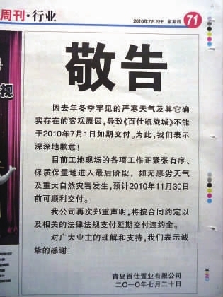 ????對于交房日期為何屢屢拖延,百仕置業(yè)方面表示,第一次延期交房是因為去年冬天極端嚴寒的天氣所致,而今年7月未如約交房,是夏季麥收忙,施工工人大量返鄉(xiāng)影響了工程進度。“我們目前已經在趕進度了,房管部門也經常來工地督促。”百仕置業(yè)項目經理王先生對記者說。