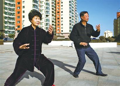 任鐵英跟老伴王大鳳一起學打太極拳