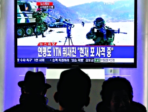 ????韓國各界對軍方舉行射擊訓練的消息十分關注。街頭公共電視屏幕前擠滿了觀眾。