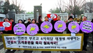 20日,首爾,韓國民眾在國防部集會抗議延坪島實彈演習。