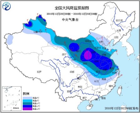 ????中新網12月28日電 中央氣象臺28日清晨發布寒潮藍色預警,預計,12月28日8時至30日8時,新疆西部和北部、甘肅大部、寧夏、陜西、內蒙古中西部、華北、黃淮、江淮、江漢、重慶北部、江南中北部等地將出現6~10℃降溫,其中,新疆北部、內蒙古西部、寧夏北部、陜西中北部、山西中南部、山東南部、河南北部和東部、安徽中北部、江蘇中西部等地的部分地區降溫幅度可達12~14℃;上述大部地區有4~6級偏北風。
