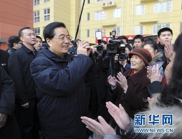 這是胡錦濤在朝陽區(qū)管莊路保障性住房常營項目麗景園小區(qū)考察時,向小區(qū)居民致以新春祝福。新華社記者 李學(xué)仁 攝