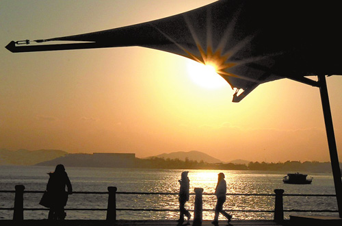 ??1月6日迎來(lái)"小寒",五四廣場(chǎng)附近的海邊,幾位游客伴著夕陽(yáng)在海邊漫步。