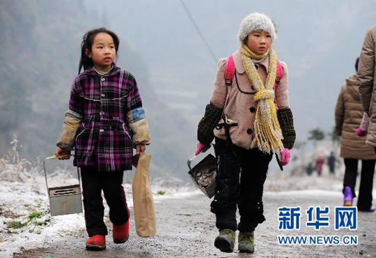 1月6日,湖南新晃縣茶坪鄉(xiāng)的孩子們手提簡(jiǎn)易火爐走在冰凍的山路上。龍弘濤 攝