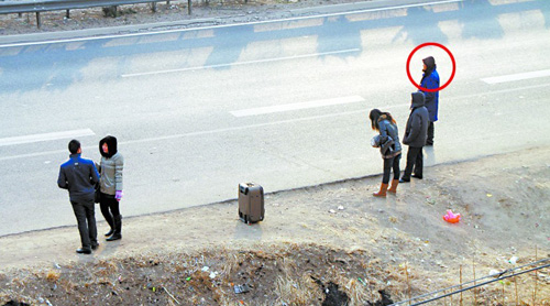????"黃牛"(紅圈內)在高速路上幫等車乘客攔車。