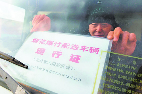 ????6時(shí)30分,車隊(duì)出發(fā)前往城陽(yáng)郊區(qū)的倉(cāng)庫(kù)。車輛在醒目位置懸掛“煙花爆竹配送車輛通行證”,證件上面明確標(biāo)注著車輛牌號(hào)、承運(yùn)企業(yè)名稱、煙花爆竹批發(fā)企業(yè)名稱、運(yùn)輸區(qū)域。