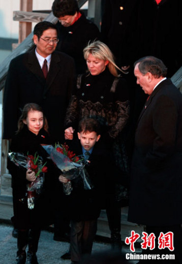中國國家主席胡錦濤結(jié)束了在美國首都華盛頓的訪問活動后,20日下午乘專機抵達芝加哥,繼續(xù)他對美國為期四天的國事訪問。圖為芝加哥市長戴利(圖右)赴機場迎接,戴利的孫子杰克和孫女瑪姬在機場手拿鮮花等候迎接胡錦濤主席。中新社記者 魏晞 攝